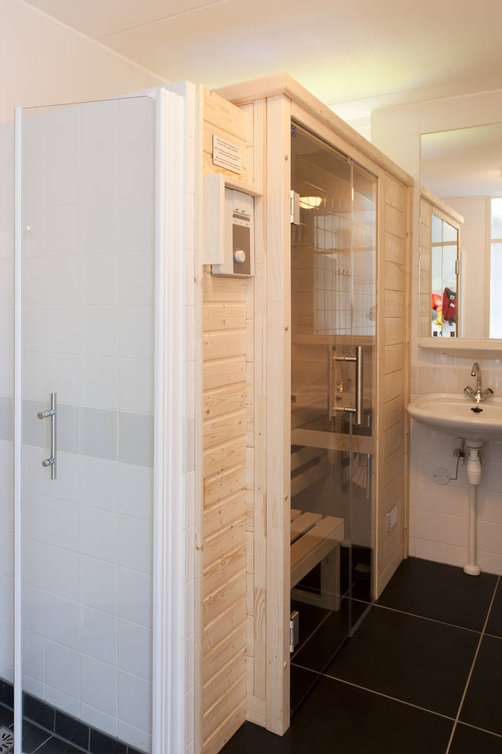 Ebenfalls im Erdgeschoss befinden sich zwei weitere Badezimmer, wobei eines mit einer finnischen Sauna für 2 Personen, Infrarotstrahler sowie separater Dusche ausgestattet ist. Das andere Badezimmer hat eine Badewanne mit Whirlpoolfunktion und eine separate Dusche. Unten gibt es zwei Toiletten.