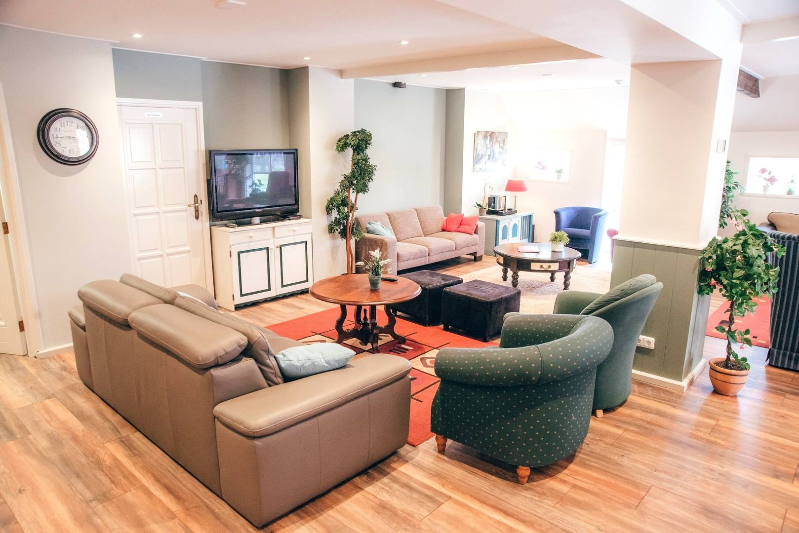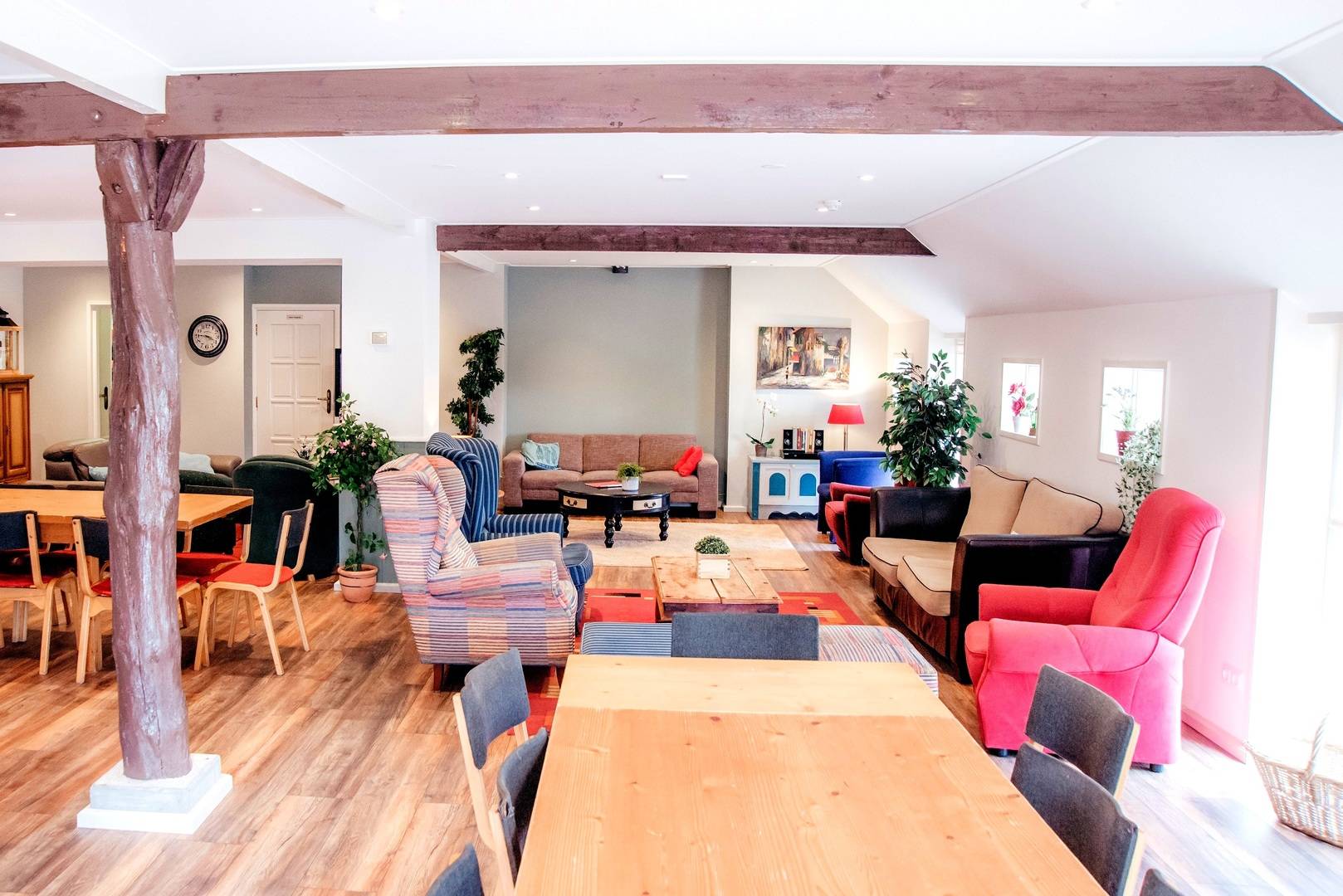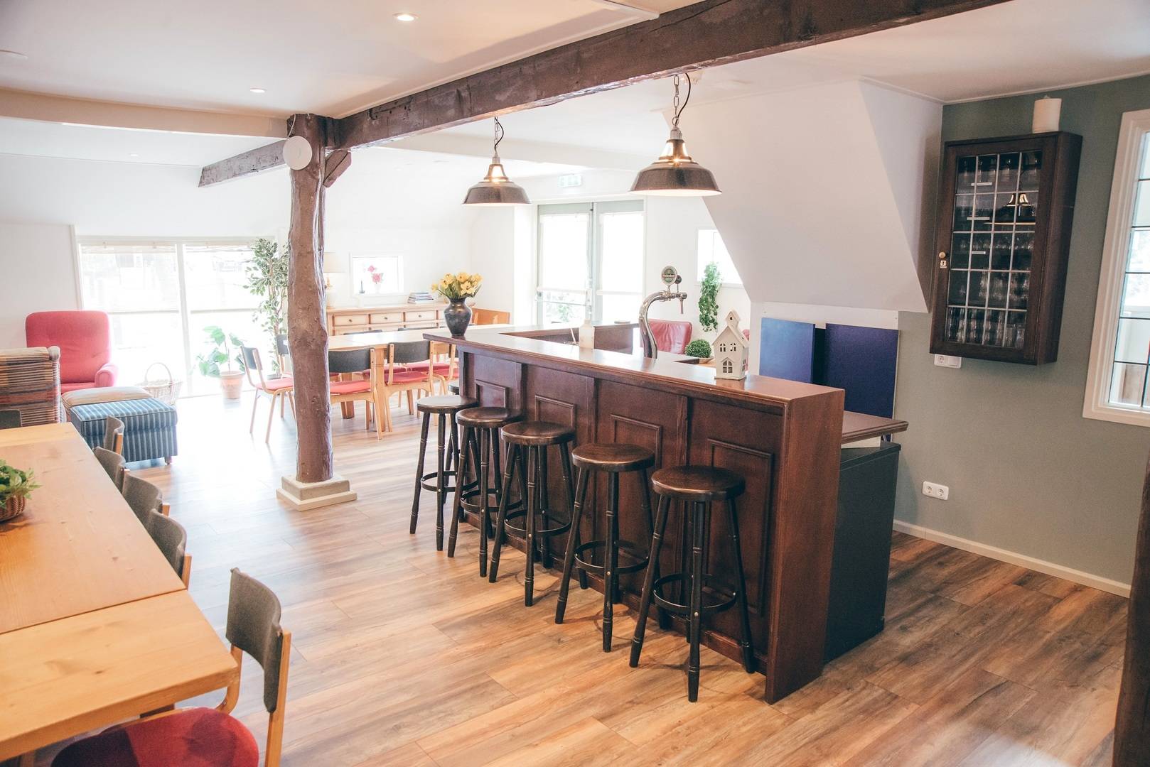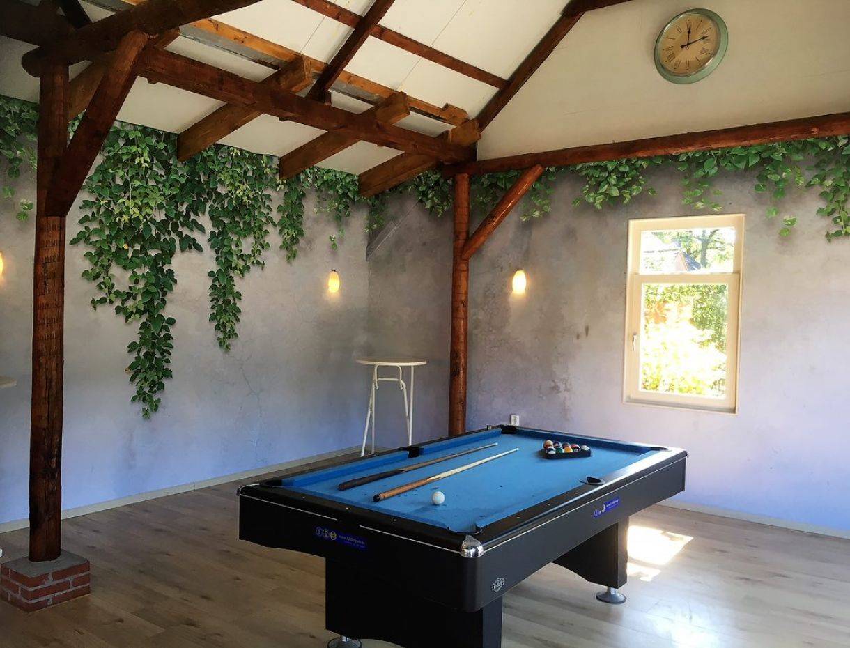 Die Gruppenunterkunft in Norg für 34 Personen hat ein sehr geräumige Wohnzimmer mit (Gas-)Kamin. Diese Unterkunft lädt zum gemütlichen Verweilen ein. Zur Entspannung stehen im Haus Sjoelbakken (niederländisches Brettspiel), Bücher und Gesellschaftsspiele zur Verfügung. Die Doppelküche bietet alle notwendigen Küchenutensilien, darunter eine Kombimikrowelle, eine Tiefkühltruhe, eine Geschirrspülmaschine, einen Ofen, eine Waschmaschine sowie einen großen Kühlschrank.