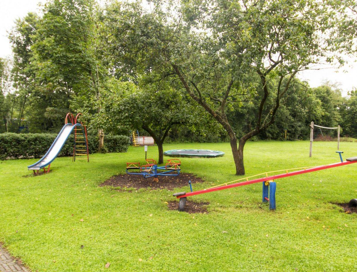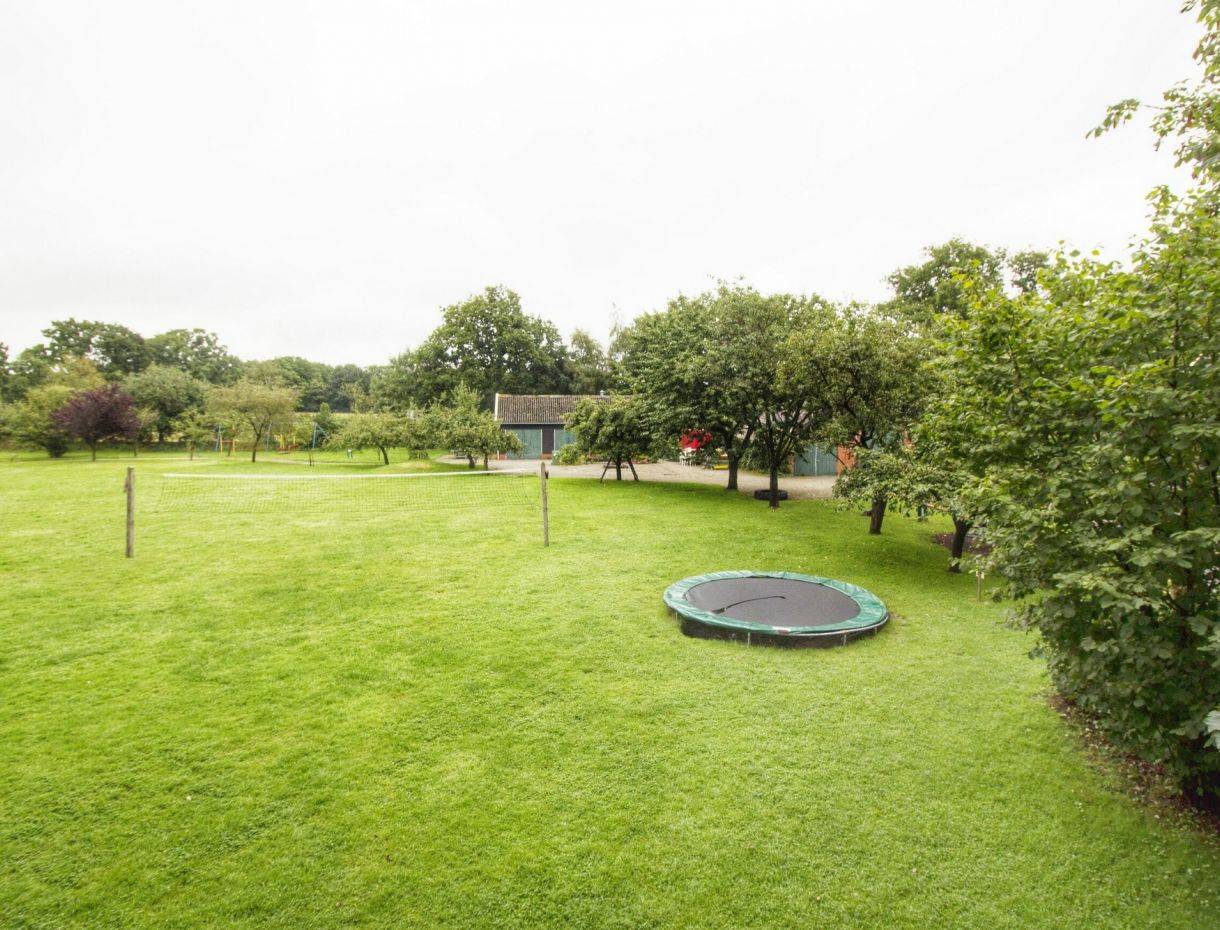 Genießen Sie die Sonne auf der Terrasse. Ein Sportfeld mit Spielplatz, Trampolin und Volleyballnetz steht Ihnen zur Verfügung.
