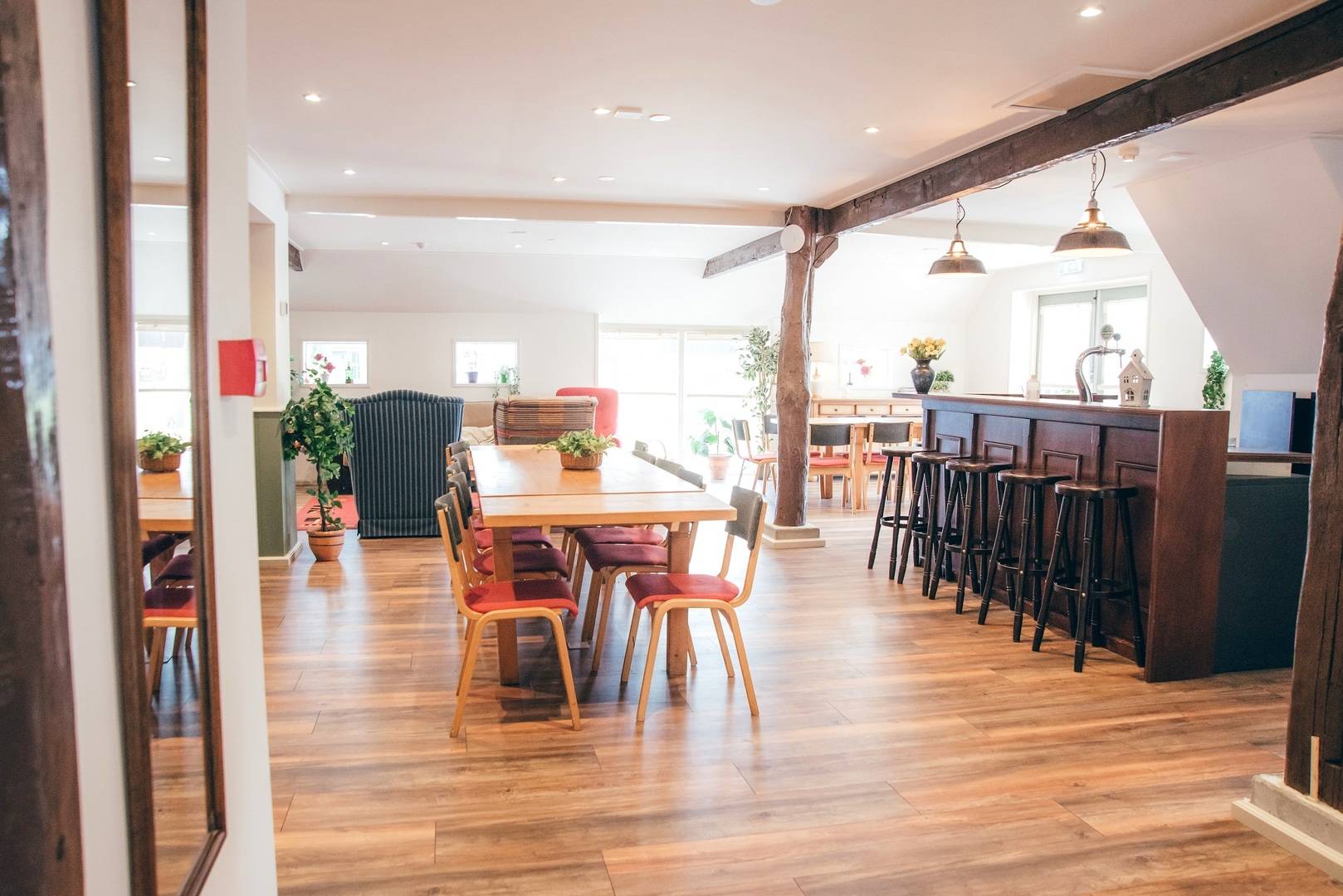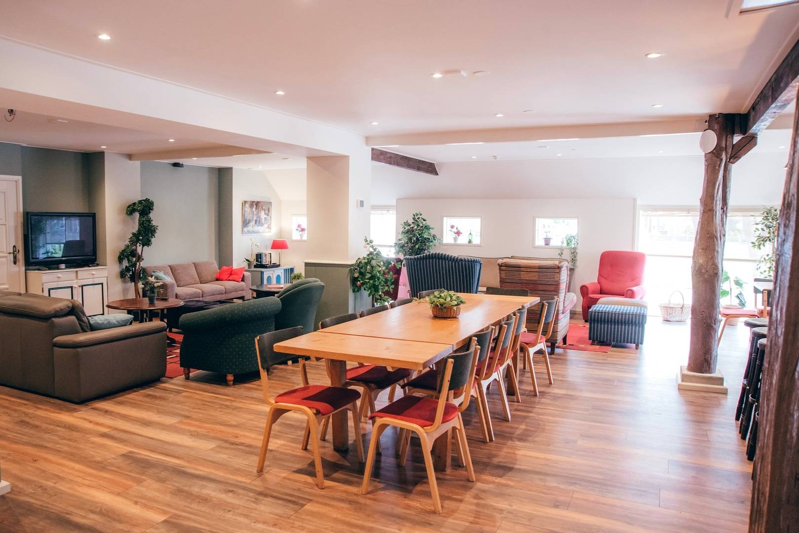 Diese gemütliche Unterkunft in Norg für 54 Personen verfügt über 16 Schlafzimmer. Es gibt zwei geräumige Wohnzimmer, zwei vollständig eingerichtete Küchen, eine Bar mit Zapfanlage und einen Kamin (Gas).