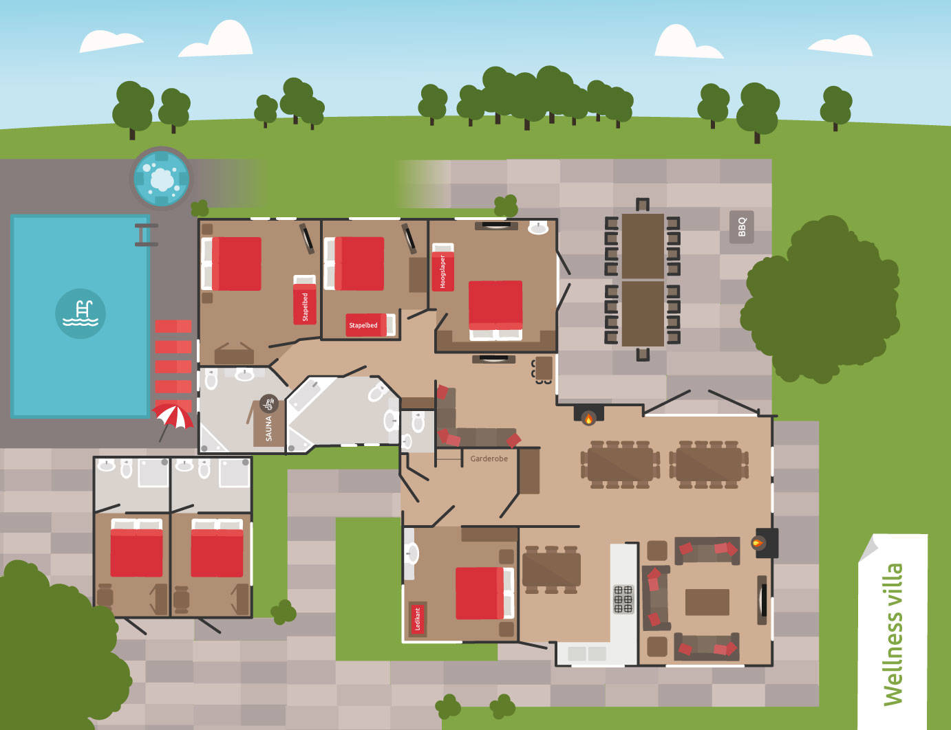 Ihr Feriendomizl für max. 18 Personen mit eigenem Schwimmbad (Gebrauch von Mei-September), Jacuzzi und Infrarot-Sauna befindet sich auf einem Ferienpark mitten in der wunderschöne Natur und Umgebung der Veluwe.