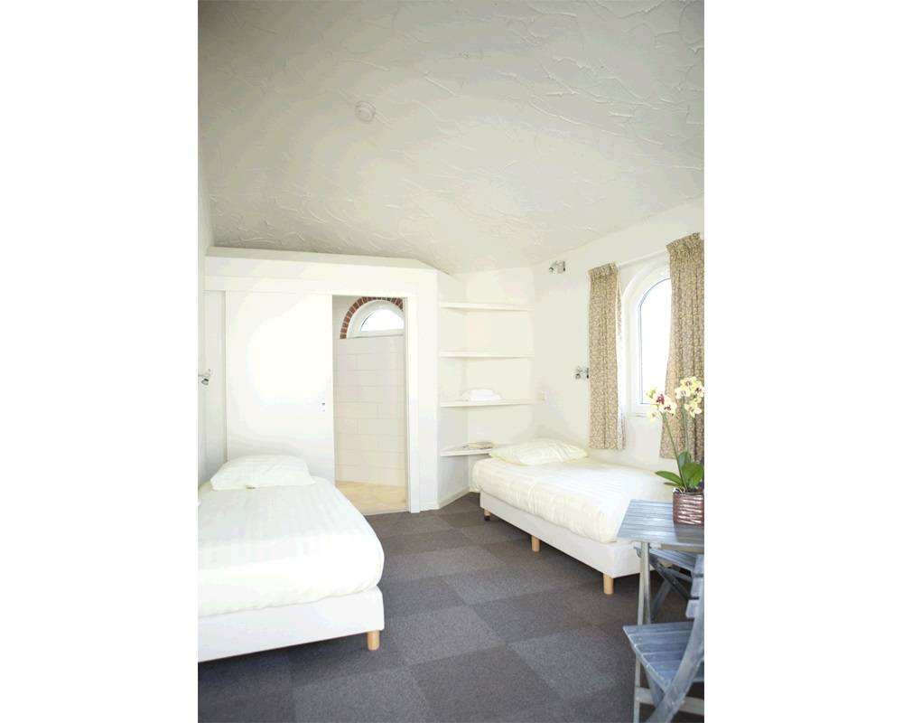 Weiterhin ist die Wohnlodge mit einem Fernseher ausgestattet, einer gemütlichen Sitzecke und ausreichend Stühle und Tische um beisammen sitzen zu können. Auch gibt es ein Badezimmer mit u.a. Toilette und Pissoir. Sowohl die Wohnlodge und die Schlafzimmer sind alle ebenerdig und somit sehr gut für Rollstuhlfahrer aber auch Menschen mit einem Handicap geeignet. Die Schlafzimmer sind verteilt in den vier anderen Häuschen. Jedes Häuschen besteht aus zwei Schlafzimmern mit je zwei Einzelbetten (Boxspring), sowie eigenem Badezimmer mit Dusche und WC. Beide Schlafzimmer in jedem Häuschen können miteinander verbunden werden dank einer Zwischentür. Ideal somit für Familien mit Kindern.