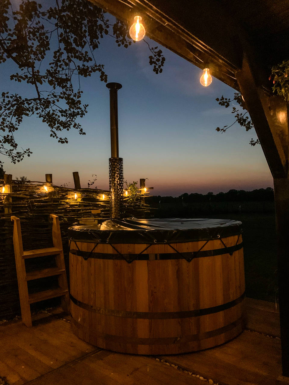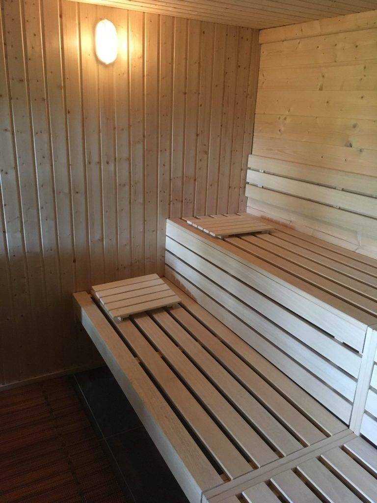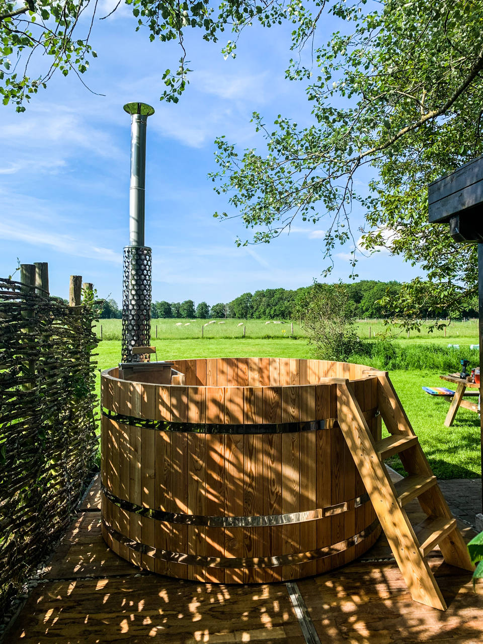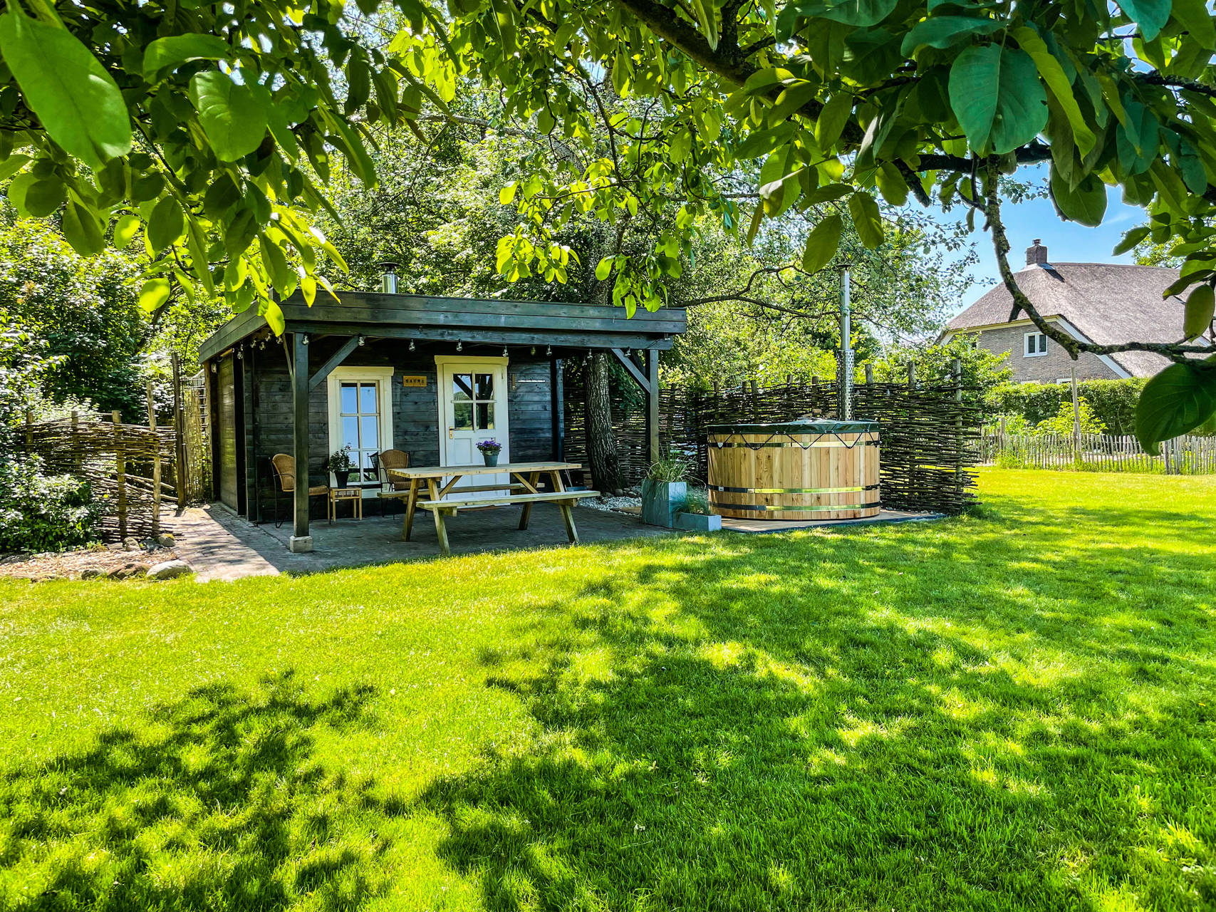 Im Garten befindet sich eine Sauna mit überdachter Terrasse, wo man gemütlich überdacht sitzen kann. Neben der Sauna gibt es auch einen holzbefeuerten Whirlpool. Die Sauna und der Whirlpool können ebenfalls gebucht werden.