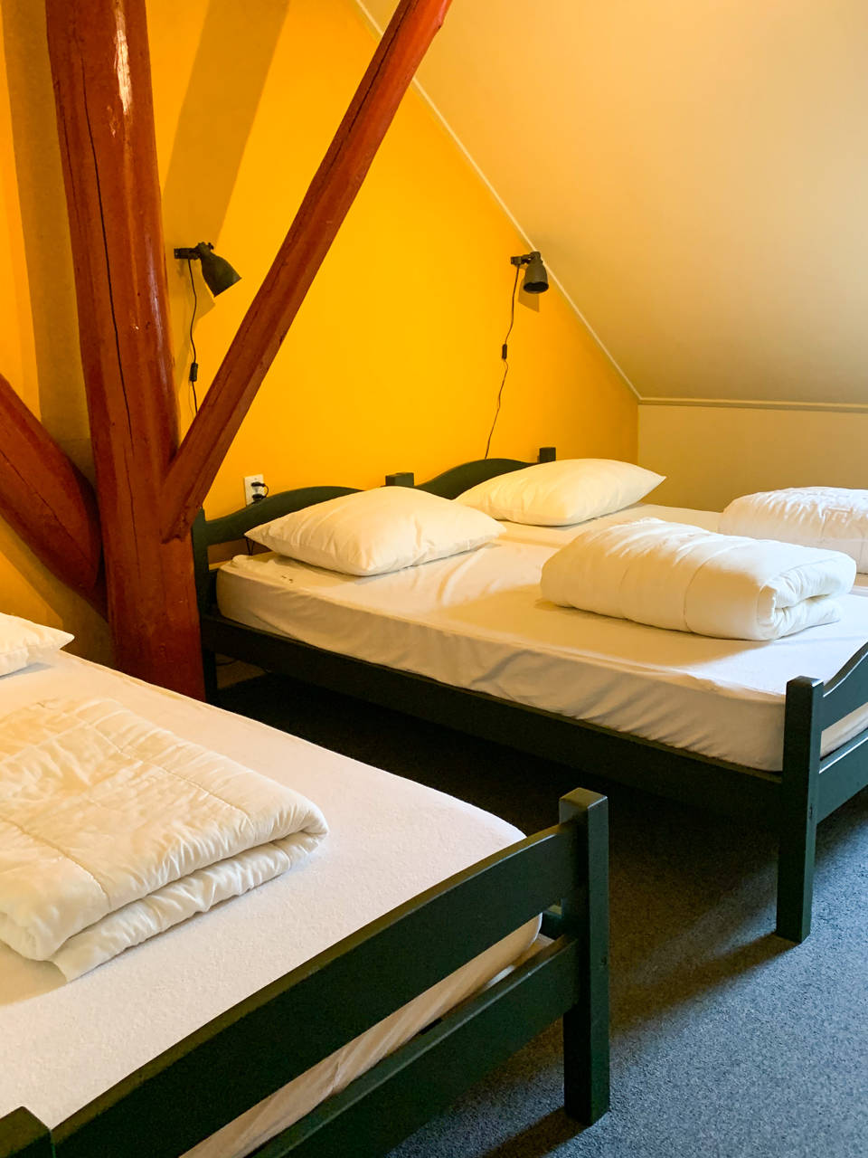 18 Einzelbetten (180 cm lang), 2 Einzelbetten extra lang (220 cm lang) und 2 Kinderbetten
