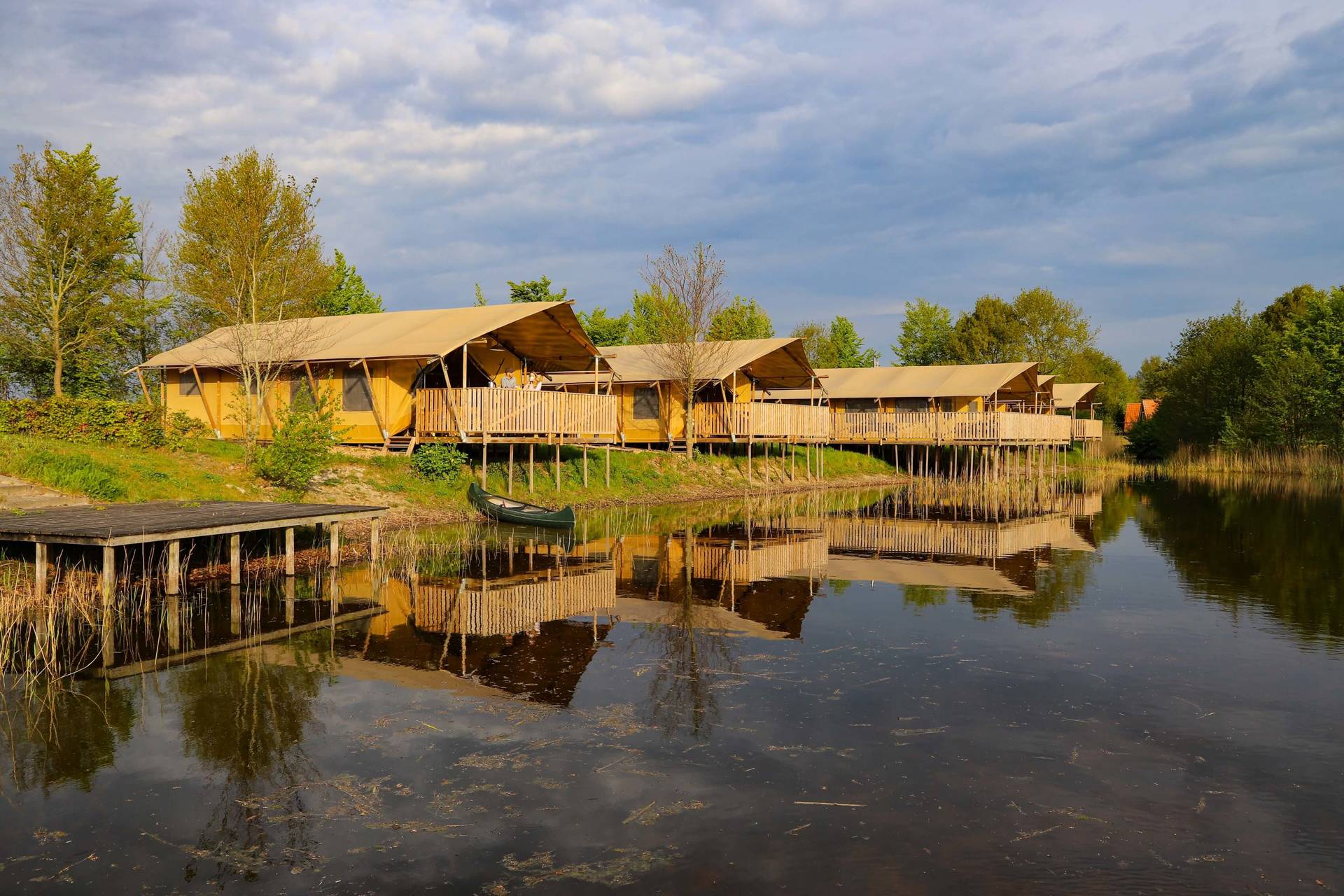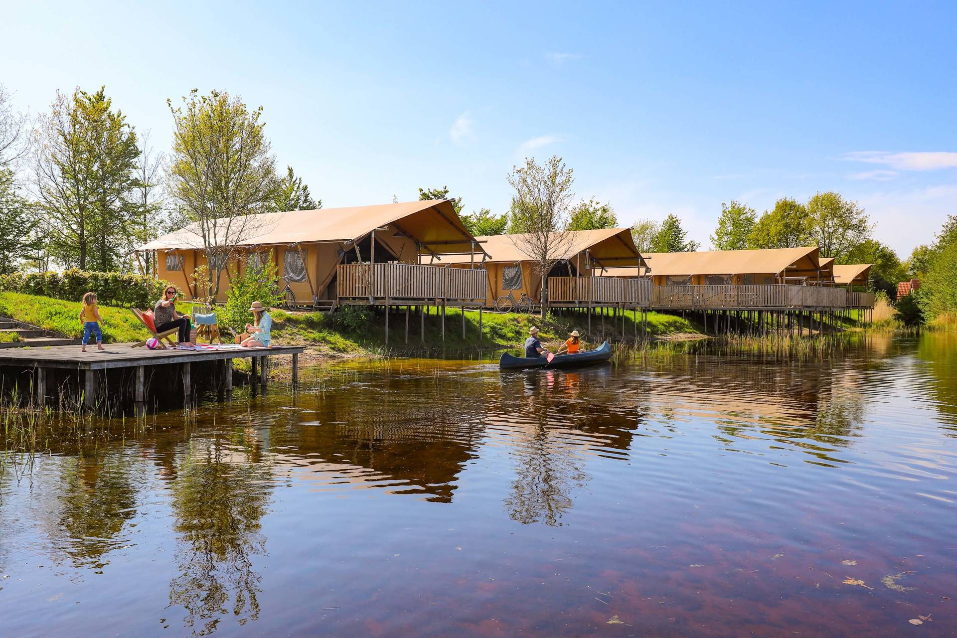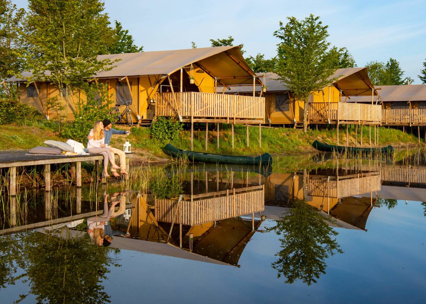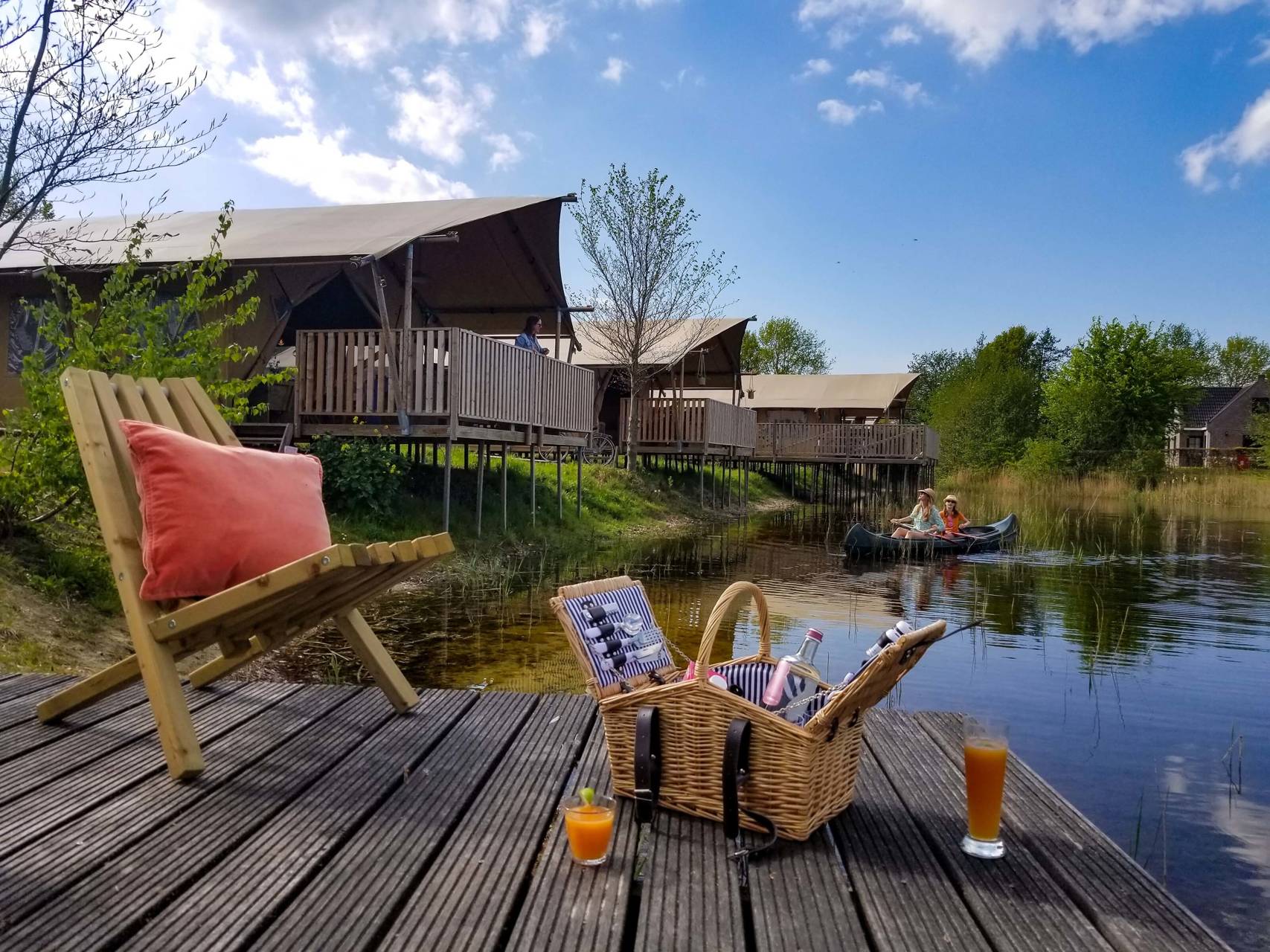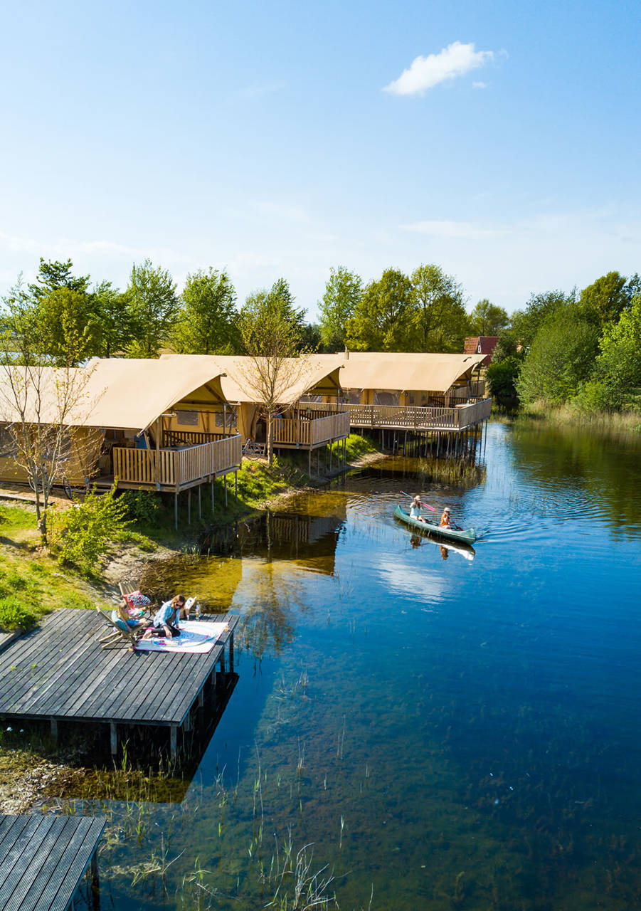 Diese Luxuszelte befinden sich am Kanuteich unseres kleinen Ferienparks. Die Vorderseite der Zelte lässt sich komplett öffnen, sodass Sie auf die Terrassenterrasse mit bequemen Gerüst-Holz-Lounge-Bänken gehen und einen freien Blick über den Teich haben. Die Zelte haben Gerüstholzmöbel und die Küche ist ebenfalls aus Gerüstholz. Zwei Schlafzimmer verfügen über 2 separate Boxspringbetten (die natürlich auch zusammengestellt werden können) und es gibt ein Boxbett für 2 Personen. Die Zelte verfügen über ein luxuriöses Badezimmer mit einer komfortablen Dusche (natürlich mit heißem Wasser), einer hängenden Toilette und Badezimmermöbeln.