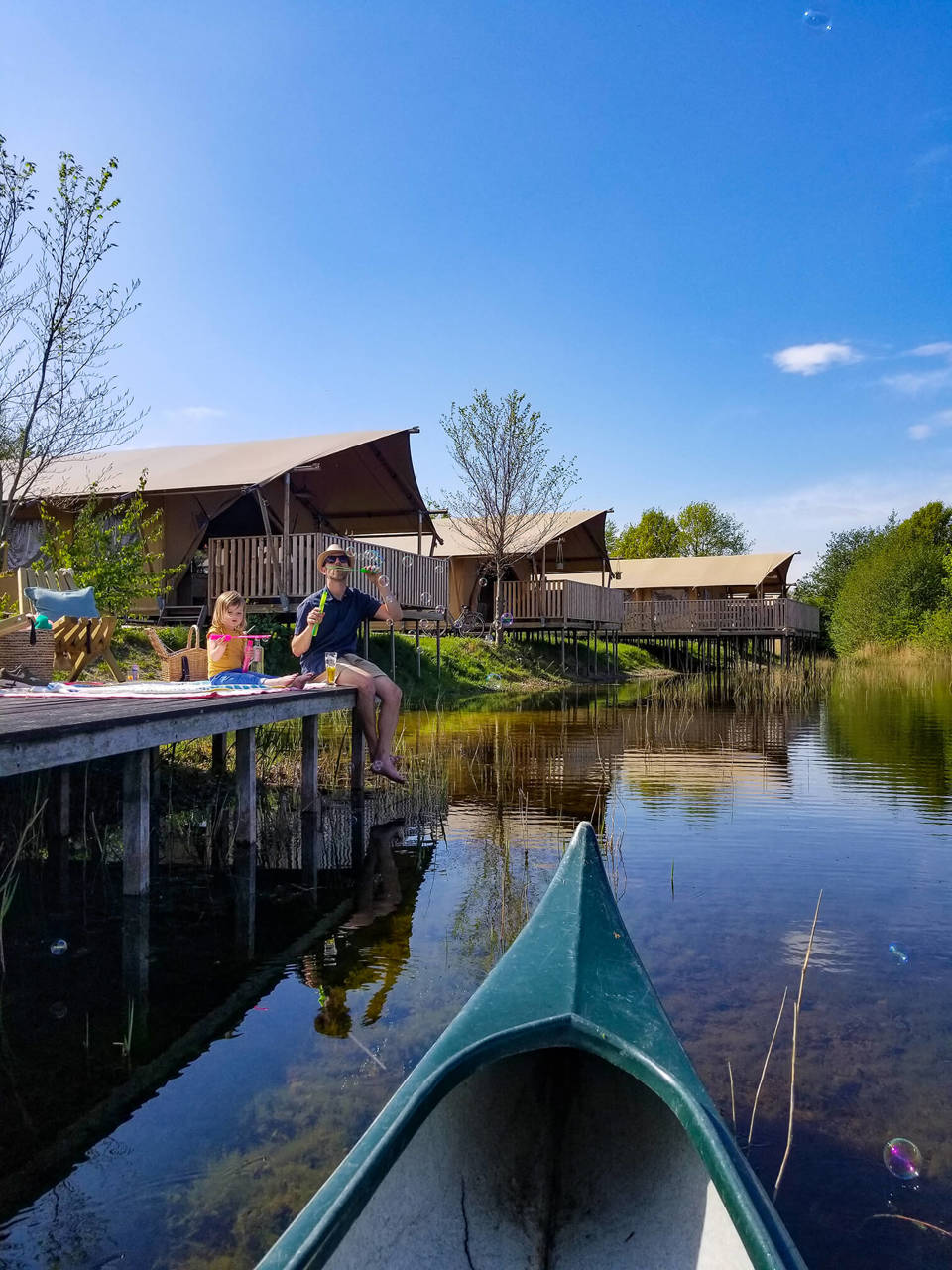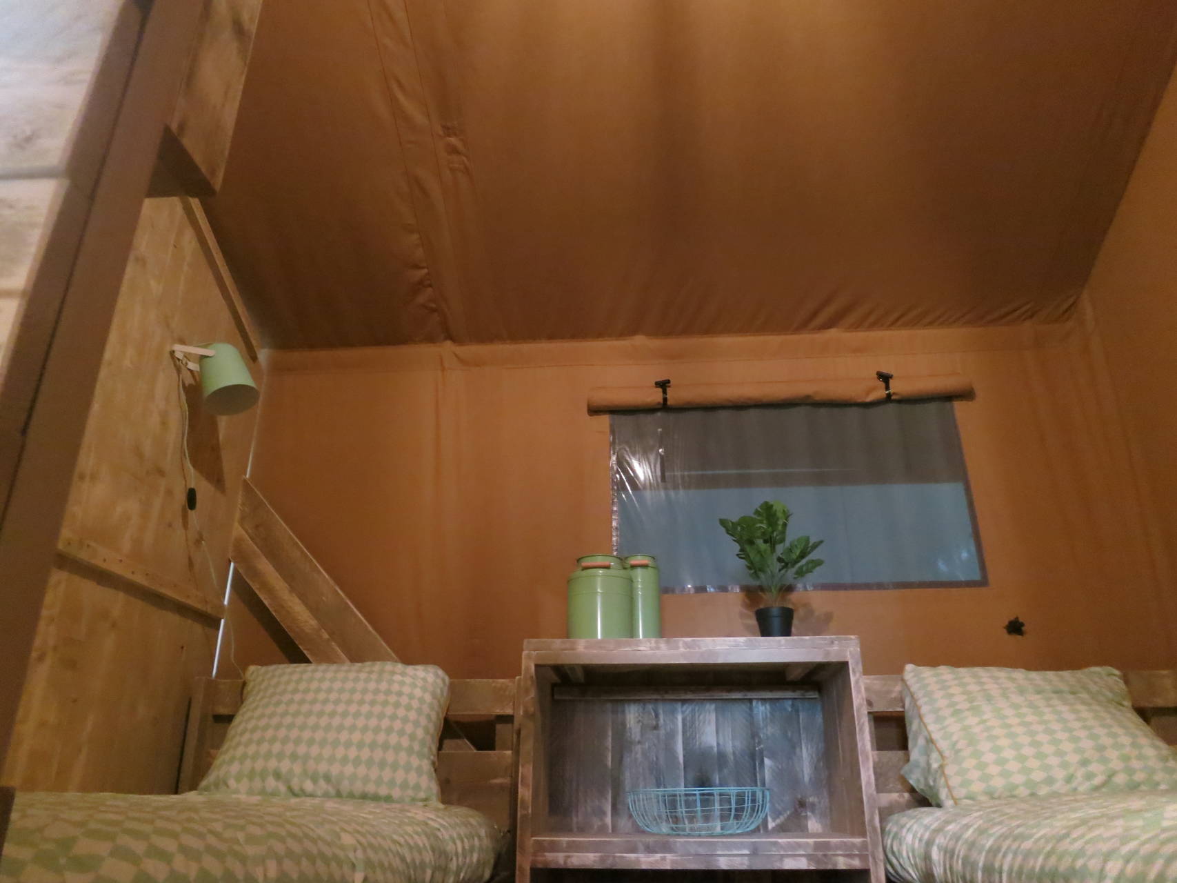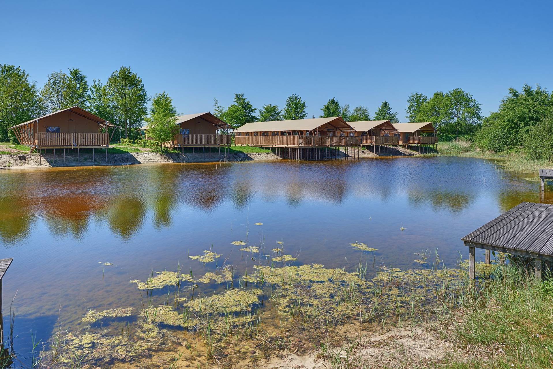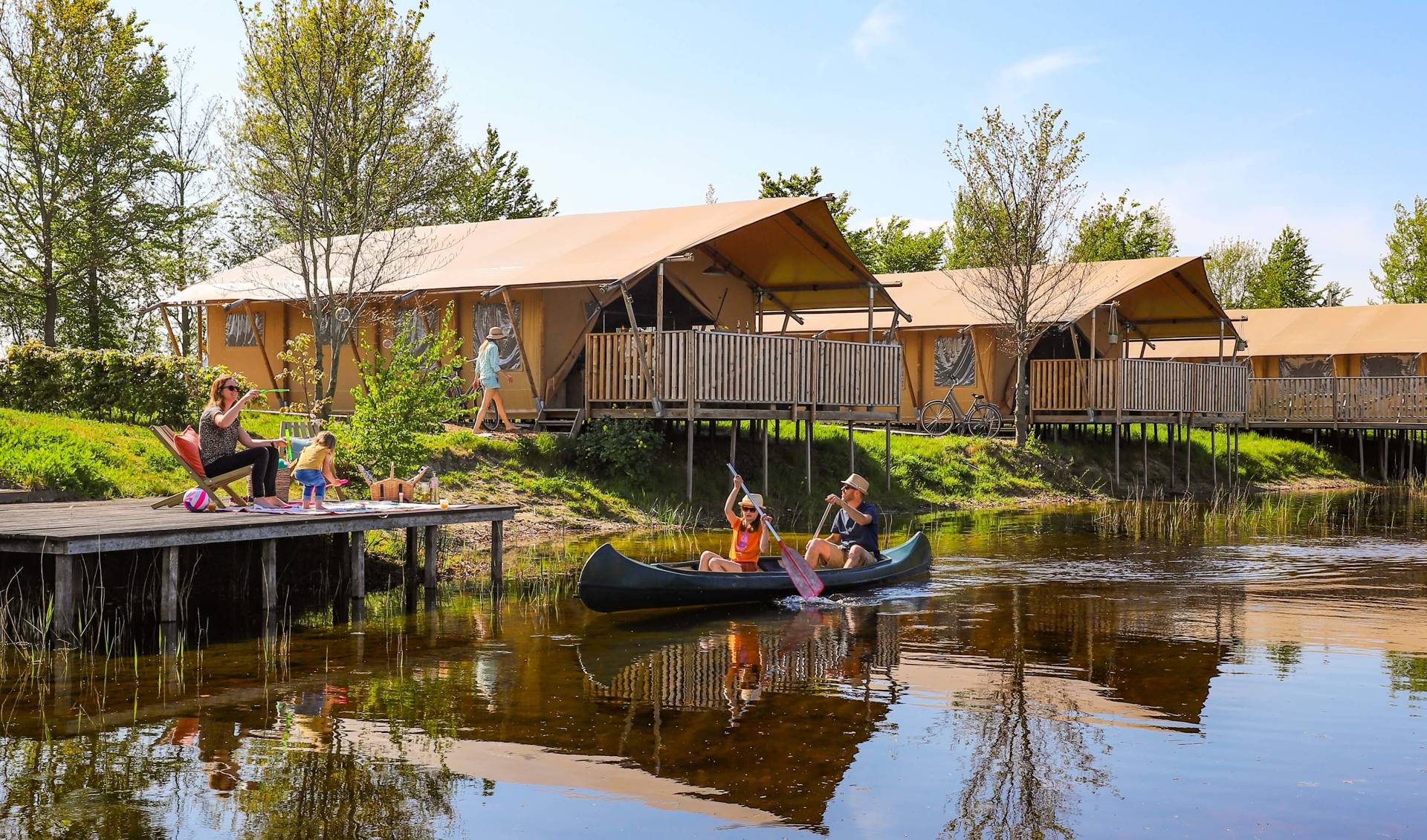 Diese Luxuszelte befinden sich am Kanuteich unseres kleinen Ferienparks. Die Vorderseite der Zelte lässt sich komplett öffnen, sodass Sie auf die Terrassenterrasse mit bequemen Gerüst-Holz-Lounge-Bänken gehen und einen freien Blick über den Teich haben. Die Zelte haben Gerüstholzmöbel und die Küche ist ebenfalls aus Gerüstholz. Zwei Schlafzimmer verfügen über 2 separate Boxspringbetten (die natürlich auch zusammengestellt werden können) und es gibt ein Boxbett für 2 Personen. Die Zelte verfügen über ein luxuriöses Badezimmer mit einer komfortablen Dusche (natürlich mit heißem Wasser), einer hängenden Toilette und Badezimmermöbeln.