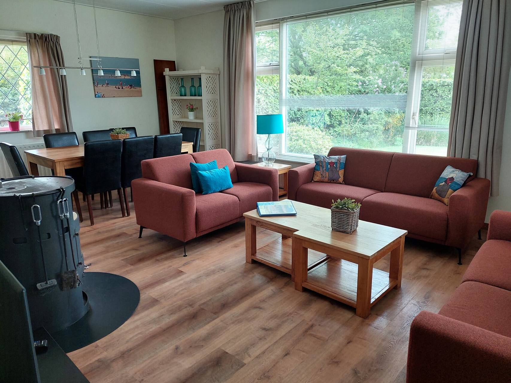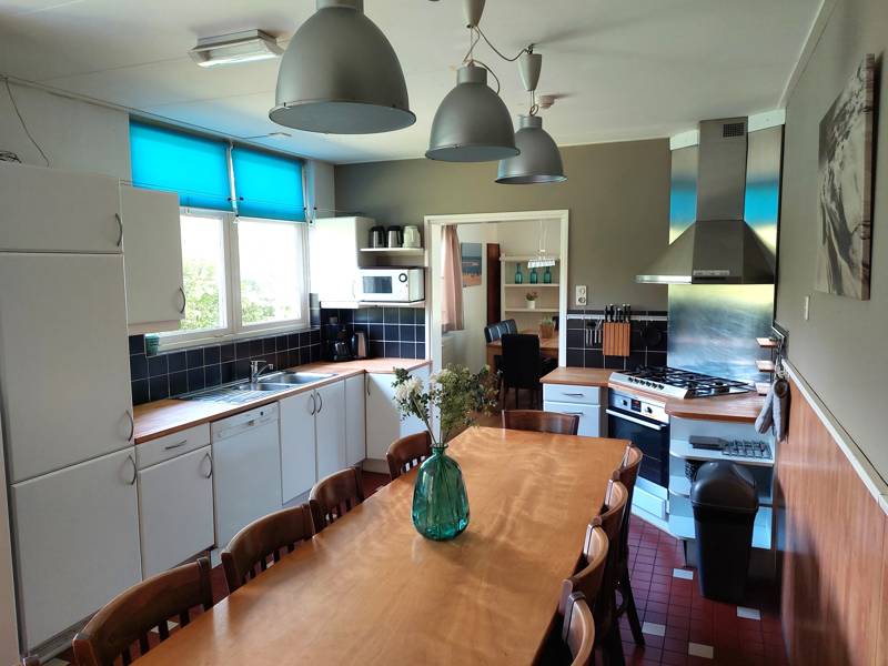 Die Küche ist komplett ausgestattet mit Geschirrspüler, Mikrowellenherd und Gefriertruhe. Im Wirtschaftsraum stehen eine Waschmaschine und ein Wäschetrockner bereit. Das gemütliche und komfortable Wohnzimmer verfügt über einen netten Holzofen und einen Sitzbereich. Ein Shuffleboard und ein Kickertisch sind vorhanden. Ein Kinderbett und ein Kinderstuhl sind standardmäßig im Haus, doch auf Anfrage können weitere Kindermöbel bereitgestellt werden. Außerhalb des Hauses befindet sich eine großzügige und überdachte Terrasse mit Picknicktisch und Möbeln sowie ein großer Spielplatz mit Hockeytoren und -stöcken. Nach der Buchung können Fahrräder angemietet werden.