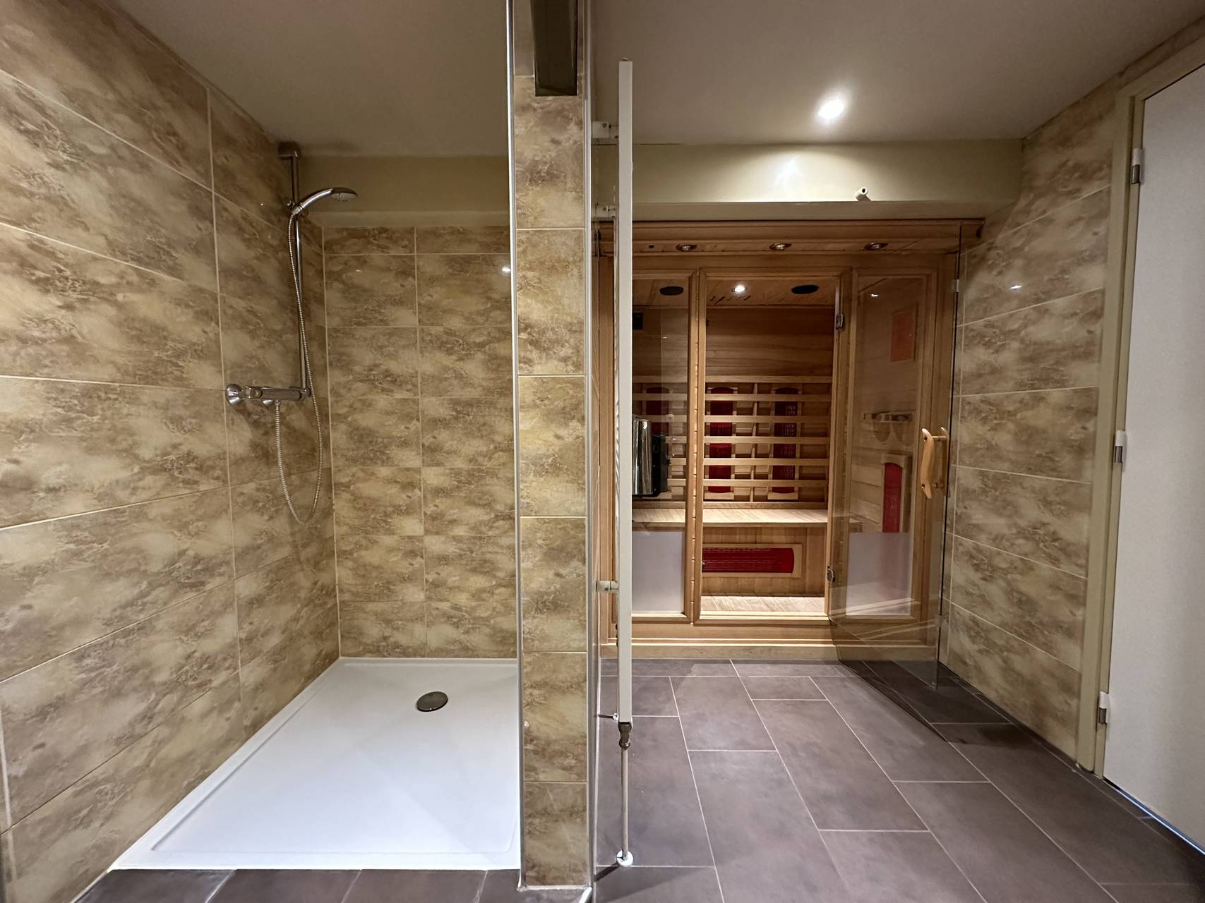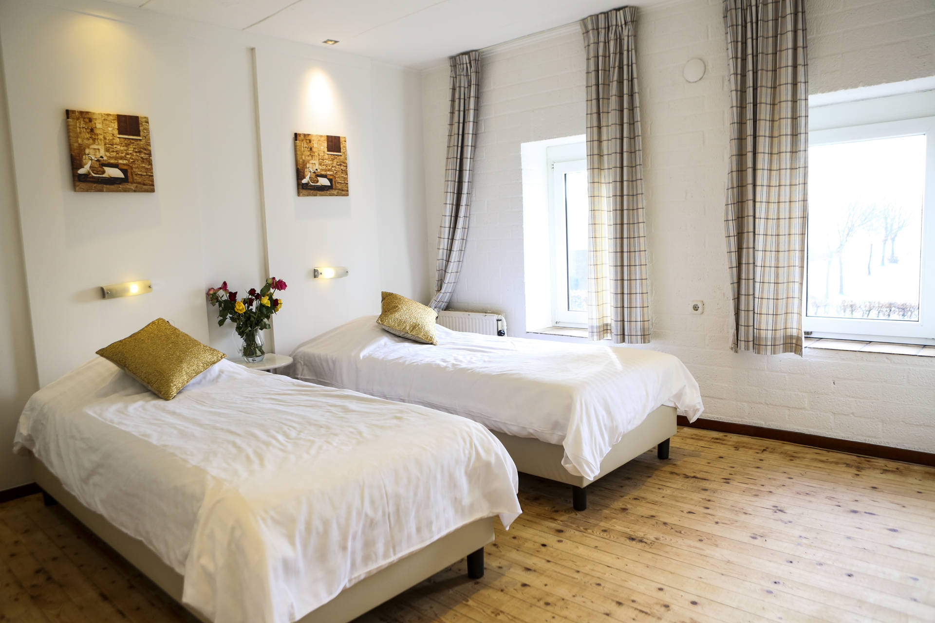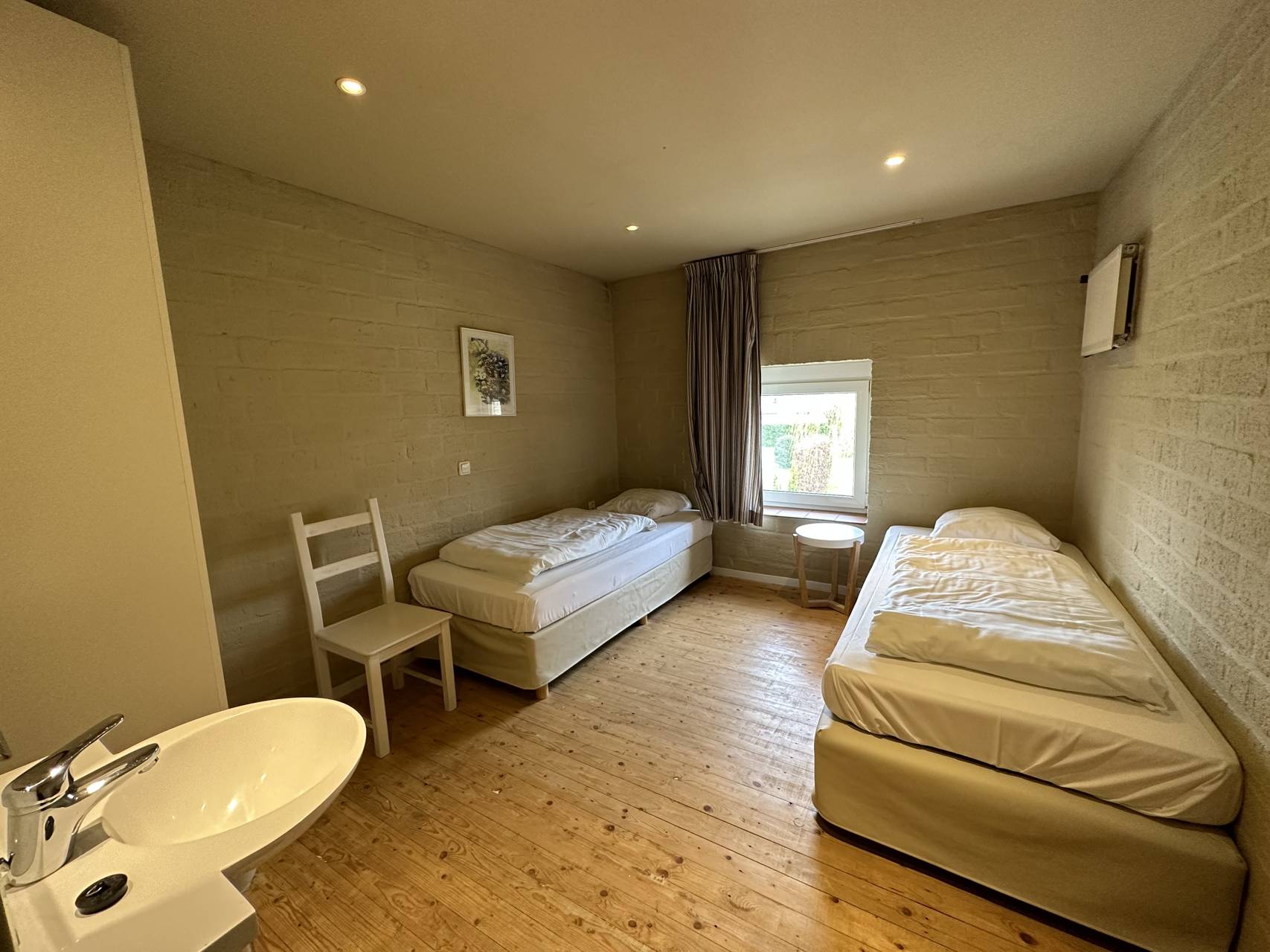 Beneden is er een slaapkamer met twee eenpersoonsbedden. Boven in totaal drie slaapkamers met twee eenpersoonsbedden. Op de begane grond is een luxe badkamer met twee douches en een toilet.