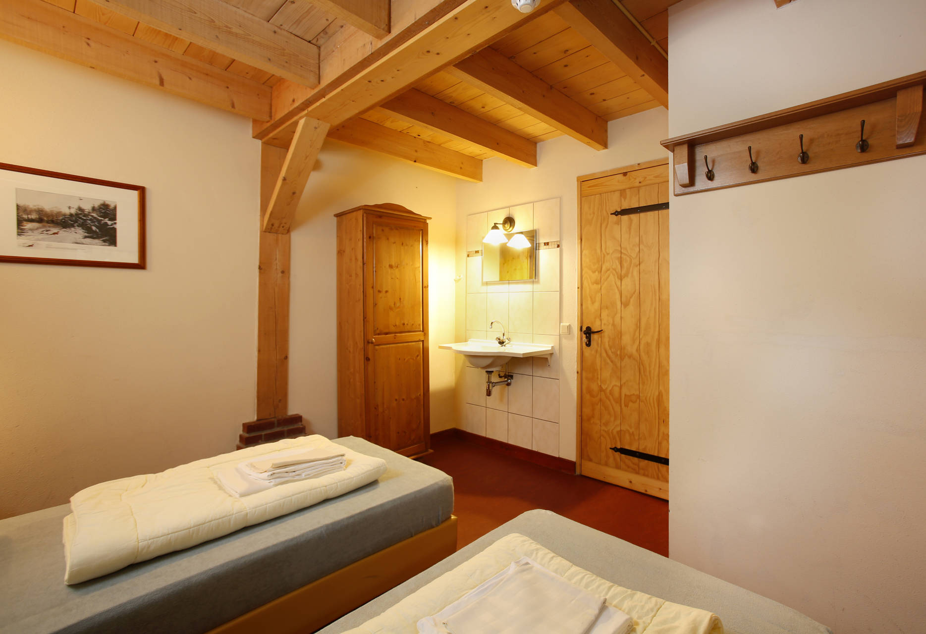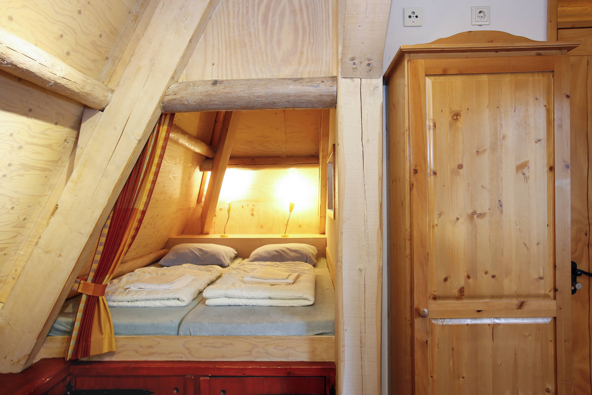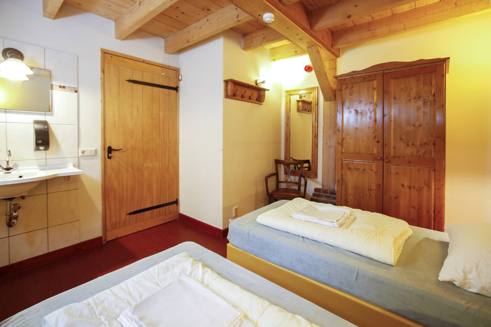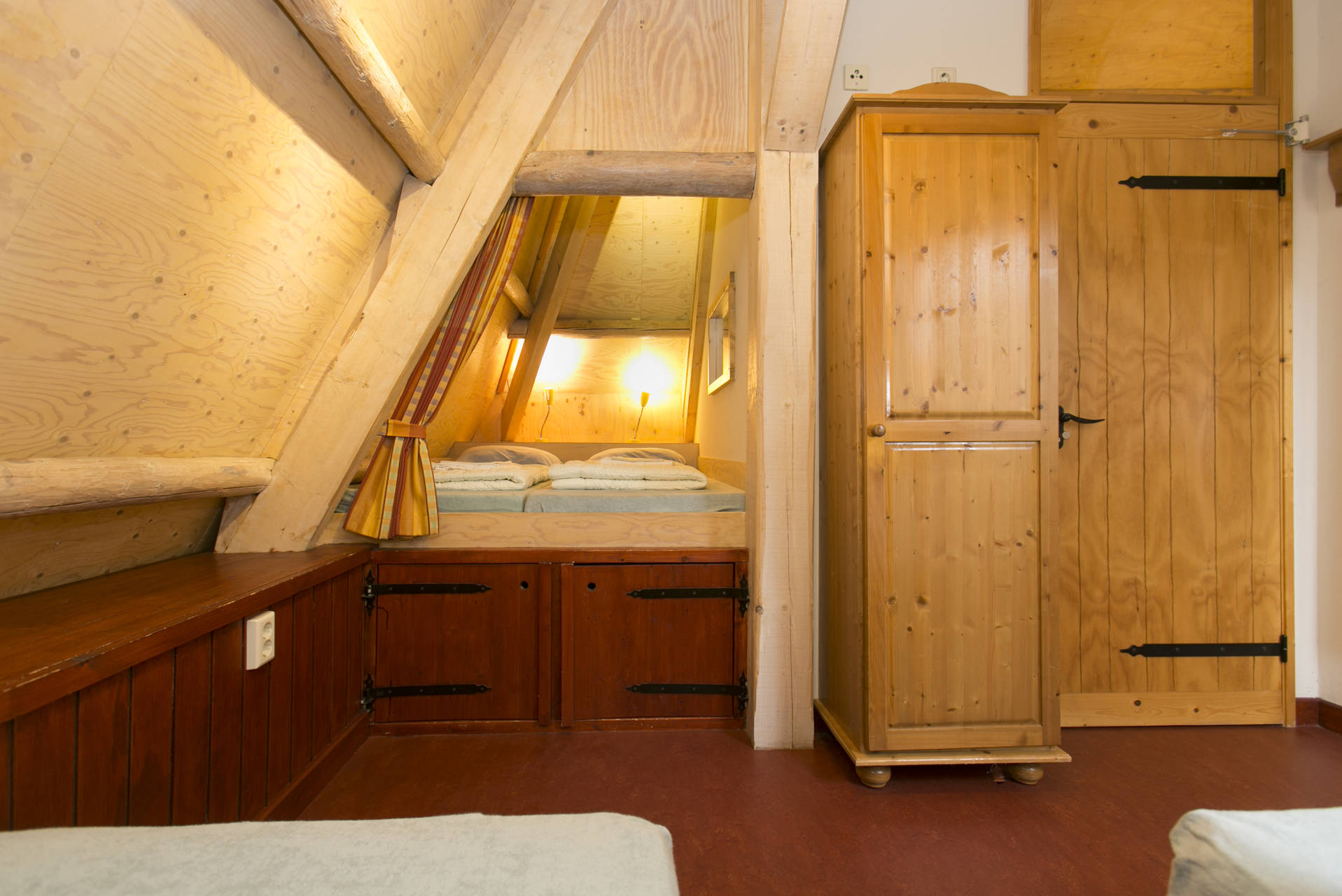 · 2 slaapkamers op de verdieping met elk een eigen badkamer, in elke kamer is plek voor 4 personen, in de bedstee 2 en in de gewone bedden ook 2