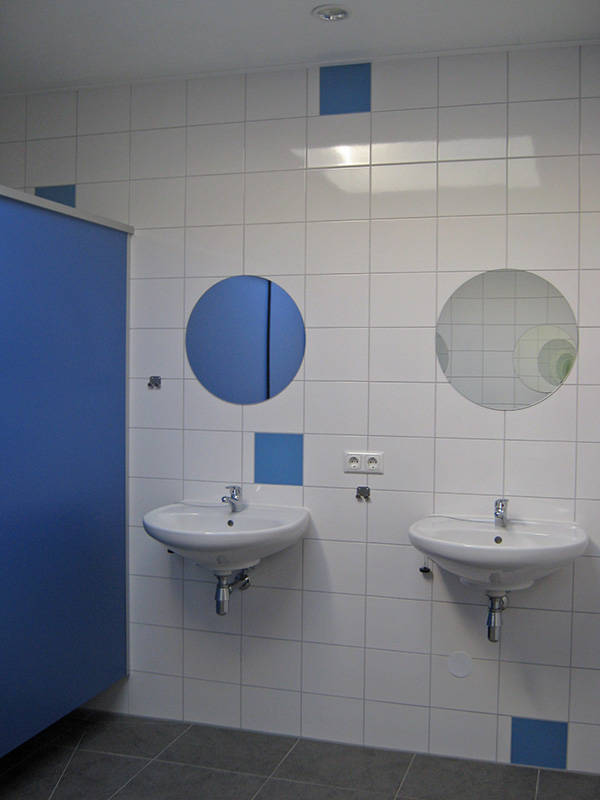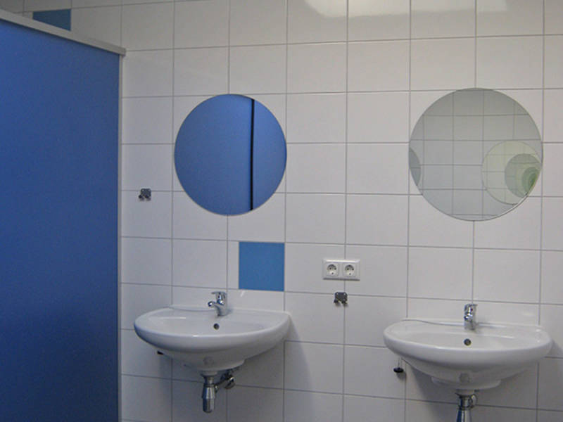 - In de buurt van de slaapkamers zijn er twee sanitaire ruimtes met in totaal vier douches, acht wastafels en vier toiletten.