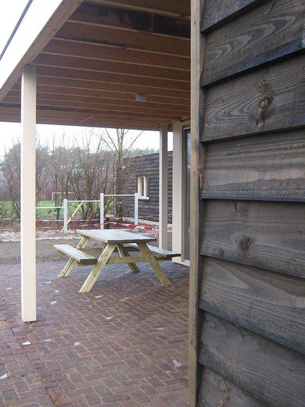 - Ruim overdekt terras met buitenmeubilair en uitzicht op het speelveld en de speelvoorzieningen.