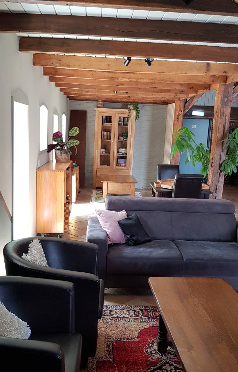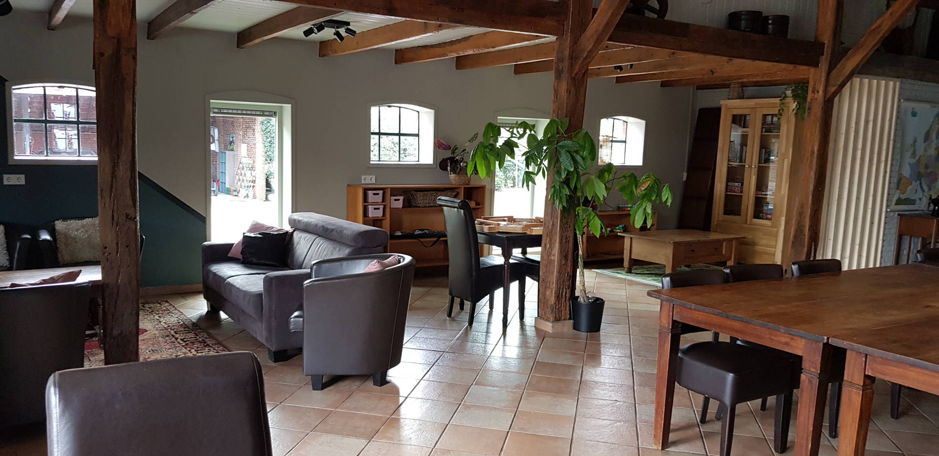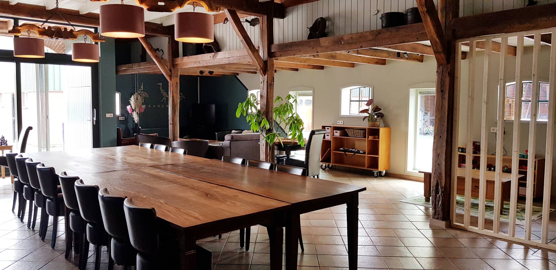 Tijdens uw verblijf kunt u gebruikmaken van een ruime, volledig ingerichte keuken die van alle gemakken is voorzien. Deze keuken grenst aan de groepsruimte en wordt hiervan gescheiden door een gezellige bar, zodat koken en samenzijn perfect samengaan. Vanuit het woongedeelte kijkt u, via een grote schuifpui, uit op onze unieke Koeientuin – de enige in Nederland waar bomen in de stal groeien.