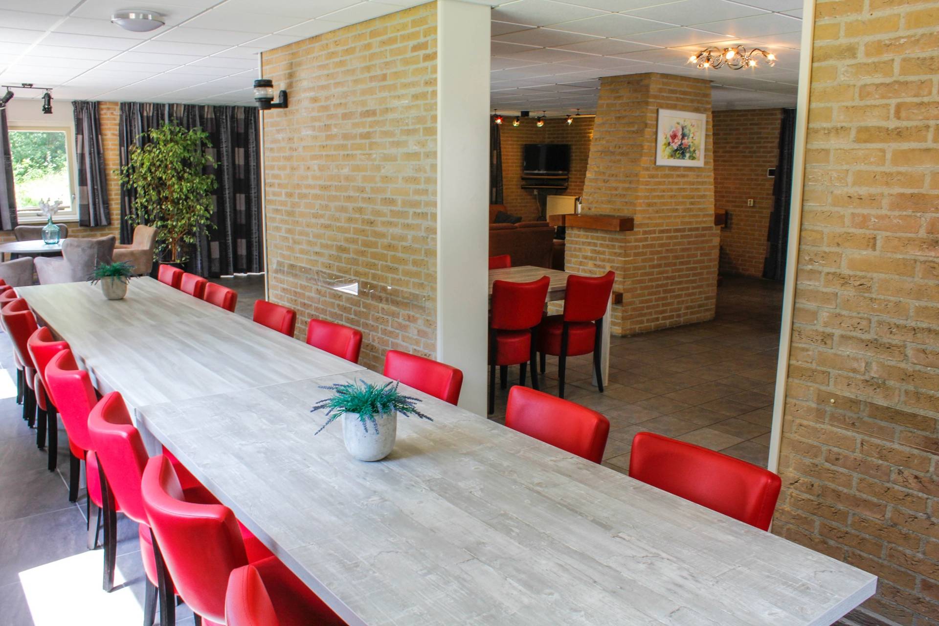 Het landhuis heeft een zeer ruime woonkamer van 125 m2. Het eetgedeelte is ingericht voor 30 personen. Als u tv wilt kijken of lekker rond de openhaard wilt zitten kan dat op één van de banken die in de zithoek staan. Daarnaast is er een grote serre waar je met gemak met 30 mensen kan koffie drinken, borrelen of een spelletje kunt doen.